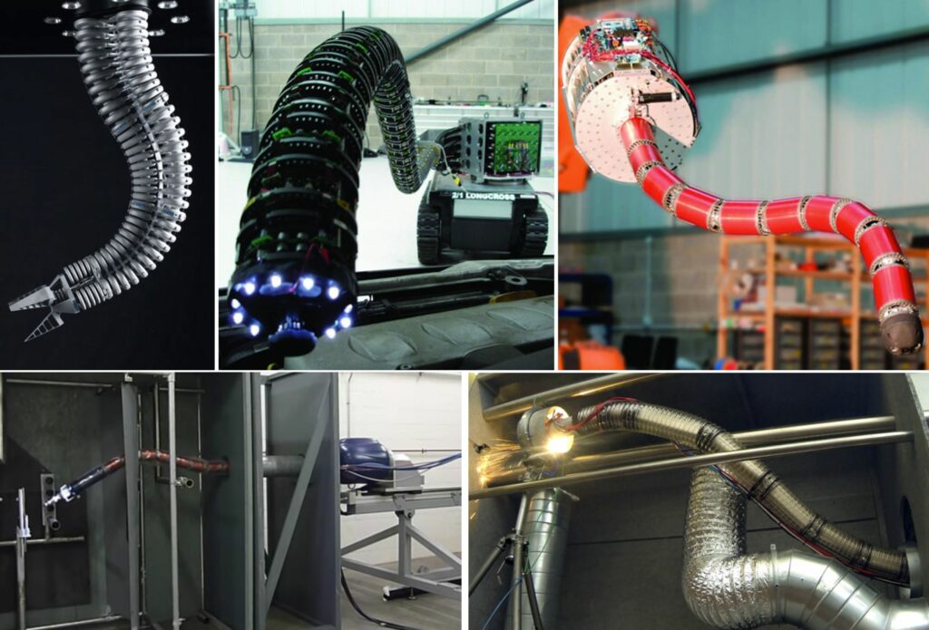 Rys. 7. Przykłady najbardziej manipulatorów typu „trąba słonia”. Górny rząd: Festo (12 DOF) i dwa manipulatory OC Robotics.