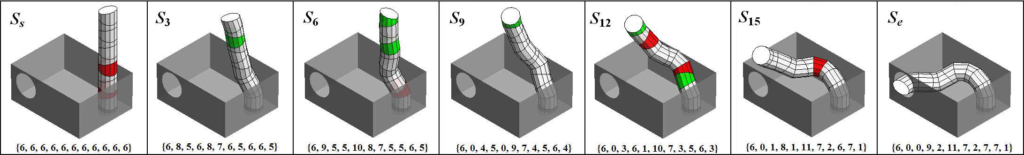 - Algorytmy sterowania hiperredundantnym robotycznym manipulatorem typu „trąba słonia”. Jednym z podstawowych problemów transformacji PZMów jest zginanie w szczelinie opisanie w [8]. Stan początkowy to rura prosta, zaś końcowy, torus. Cała transformacja powinna zawierać się w szczelinie o minimalnej szerokości. Przykładowe zginanie w siedmiu dyskretnych krokach 16-to modułowego PMSa obliczonego przy pomocy optymalizacji rojem cząstek (PSO) pokazano na Rys. 5. Znacząco ciekawszy i bardziej złożonym problem zdefiniowano w sposób następujący: znajdź transformację PMSa od stanu początkowego do końcowego, takiego że czoło PMSa znajdzie się najbliżej jak to możliwe do zadanego punktu w przestrzeni. Dodatkowo nałożono ograniczenia: chybotliwość czoła ma być minimalna, oraz zabronione są kolizje z otoczeniem. W prezentowanym w [8] przypadku problem auto-kolizji nie występuje, gdyż PMS nie jest wystarczająco długi. Rys. 6 ilustruje rozwiązanie obliczone również przy pomocy PSO.