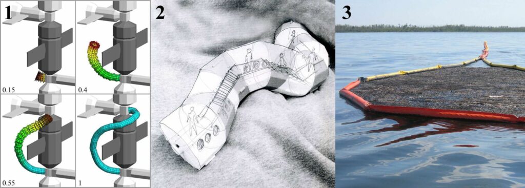 Rys. 1. Po lewej: wybrane kroki ciągłego rozkładania 40-to elementowego kołnierza z przystających elementów „obchodzących” Moduł Zarya na Międzynarodowej Stacji Kosmicznej. Odcień zabarwienia elementów koresponduje ze stopniem otwarcia. Czerwony i błękitny odpowiednio wskazują na w pełni zamknięty i otwarty stan. Dla każdego stanu podano stopień otwarcia w lewym dolnym rogu. W środku: wizualizacja koncepcji bazy w ekstremalnym środowisku w układzie „banana-split”. Po prawej: (modularny?) system oczyszczania powierzchni wody z wycieku ropy naftowej w ofercie Canadyne Technologies Inc.