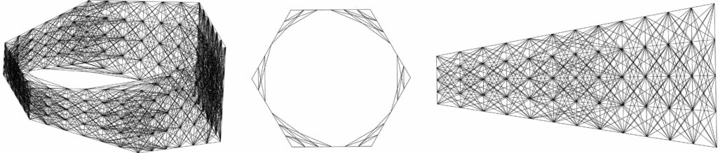 - Zaadaptować metodę konstrukcji bazowej (ang. ground structure) [7] i przeprowadzić topologiczną optymalizację konstrukcji pojedynczego modułu. Liczba różnych globalnych konfiguracji konstrukcji PMS rośnie wykładniczo wraz ze wzrostem liczby modułów, globalna optymalizacja PMS jest więc zadaniem numerycznie zbyt czasochłonnym. Naszym celem jest wykorzystanie powyższego modelu hierarchicznego w celu opracowania lokalnej reprezentacji różnych geometrycznych konfiguracji PMS w równoważnej postaci zbioru lokalnych obciążeń brzegowych pojedynczego modułu. Tego typu reprezentacja umożliwi wykorzystanie zaadaptowanej metody konstrukcji bazowej i przeprowadzenie lokalnej optymalizacji topologicznej modułu poddanego wielu niezależnym obciążeniom. Iteracyjne metody optymalizacji pozwolą rozwikłać spodziewaną zależność obciążeń brzegowych i wewnętrznej topologii. Przykładowa konstrukcja bazowa została przedstawiona na Rys. 4.