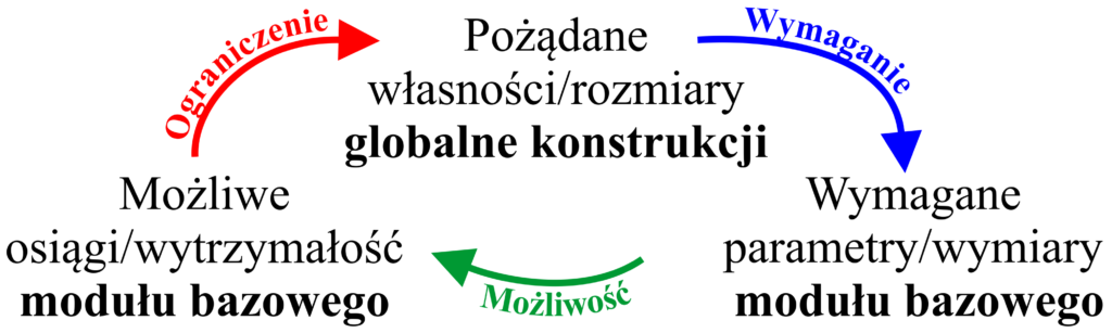 - opracowanie metody reprezentacji zbioru konfiguracji globalnych konstrukcji modularnej w postaci zbioru lokalnych obciążeń brzegowych pojedynczego modułu oraz