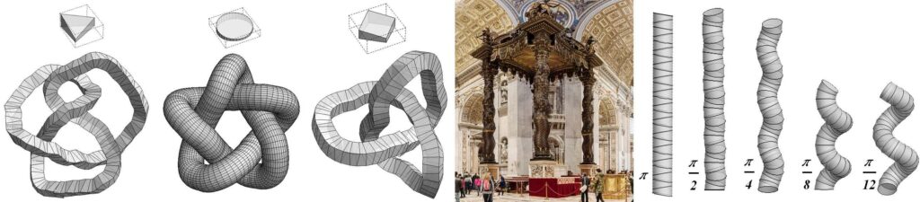 Rys. 2. Po lewej: Różne rodzaje węzłów matematycznych skonstruowanych z przystających modułów: Ósemka (41), Pięciolistnik (51) i Trójlistnik (31). W środku: historyczny przykład kolumny spiralnej: Baldachin w Bazylice św. Piotra (AD 1634, arch. Bernini). Po prawej: przykłady sterowalnych kolumn spiralnych skonstruowanych z identycznych modułów o różnych względnych skrętach (wartości skrętów pokazano).
