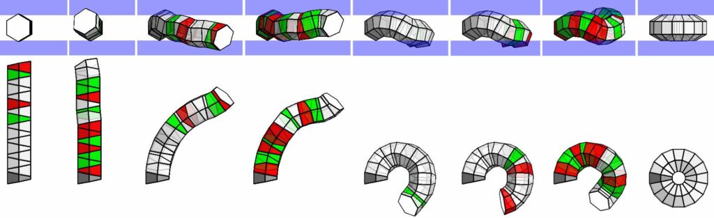 Rys. 5. Najlepsze rozwiązanie dla 16-to modułowego PMSa złożonego z sześciokątnych modułów bazowych z „rura prostej” do pełnego torusa. Zielony i czerwony wskazują odpowiednio: skęcenie danego modułu w prawo i lewo.